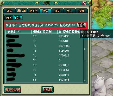 授业等级可直接在"徒弟"面板中提升。